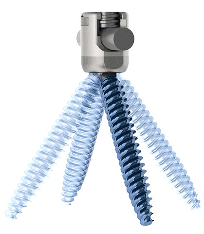 The EVEREST Degenerative Spinal System is a top-loading polyaxial pedicle screw system with the ability to accommodate titanium and cobalt chrome rods of two different diameters. The dual-lead thread pattern allows for faster insertion and demonstrates increased pullout strength. [1] The mixed-metal (Ti/CoCr) tulip minimized head splay and demonstrated improved biomechanical performance when tested against an all-titanium alloy screw. [2]