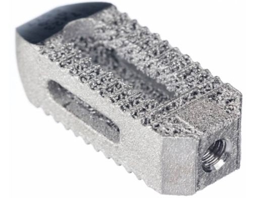 A hollow, rectangular implant that consists of a unique configuration of both solid and porous structures built using AMagine Technology, our proprietary approach to implant creation using additive manufacturing